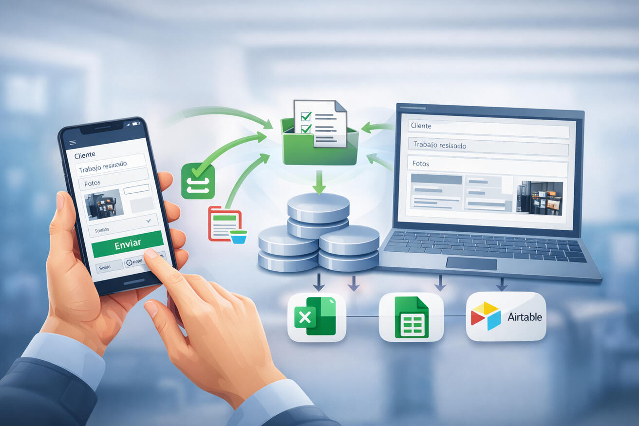 Formularios que alimentan tu sistema, no tu caos. Creamos formularios que no acaban en un email, sino en datos útiles. Formularios desde la app o web Datos estructurados Históricos claros.
